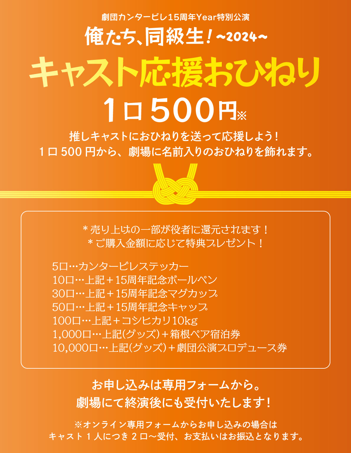 推しキャストあてに1口500円で、劇場に名前入りのおひねりを飾れます。おひねりを送って推しキャストを応援しよう!売り上げの一部はキャストに還元されます。また、ご購入金額に応じて特典をプレゼント!!